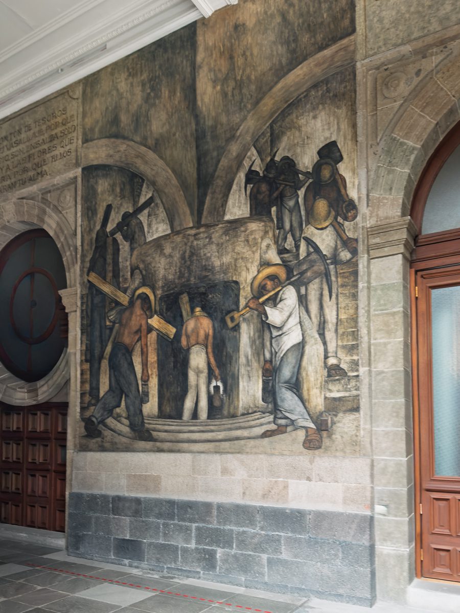 The first mural shows laborers at work in a mine and is located inside the Palacio Nacional. It was paid for by the Mexican government after the Mexican Revolution (1910-1920).