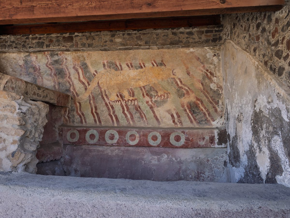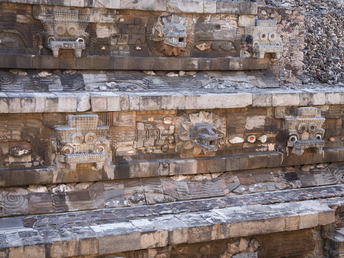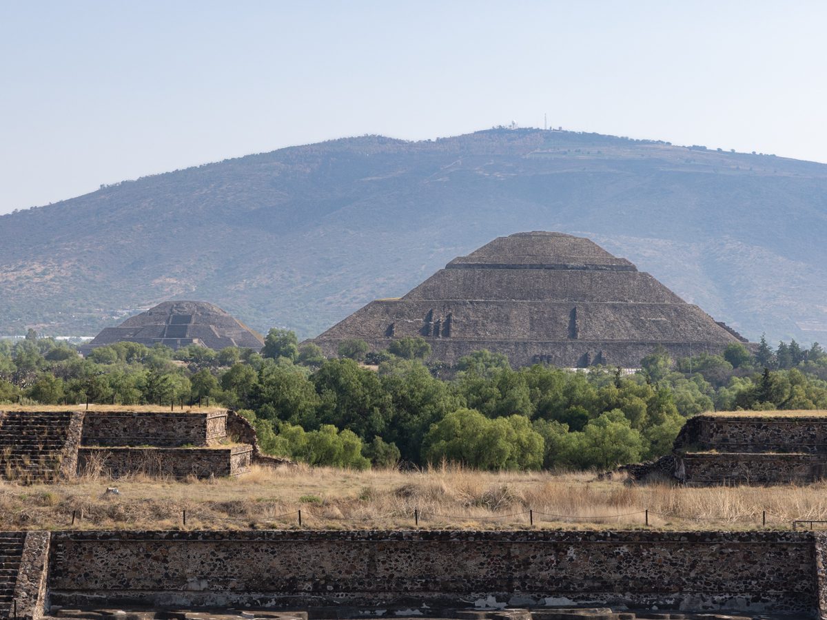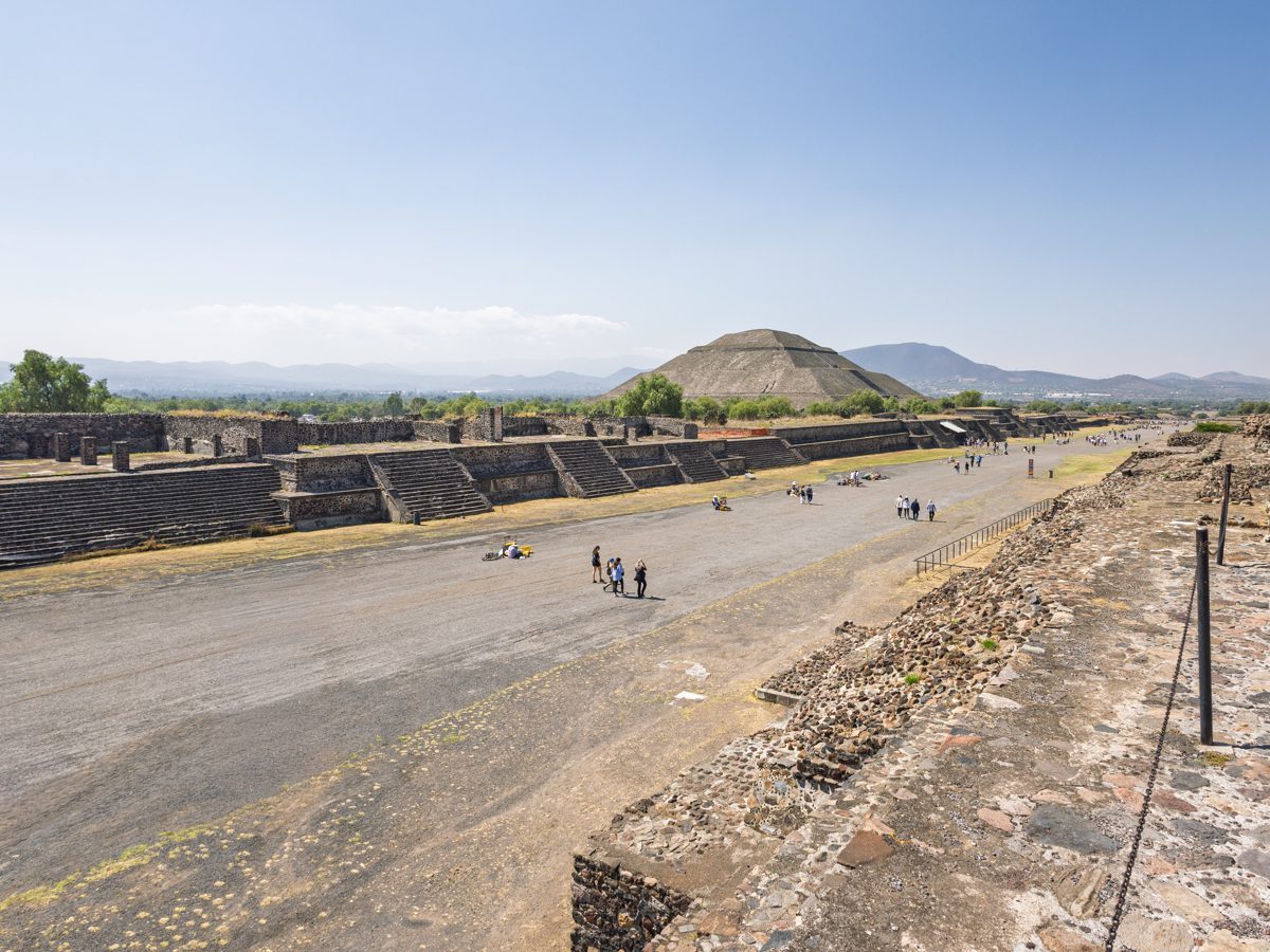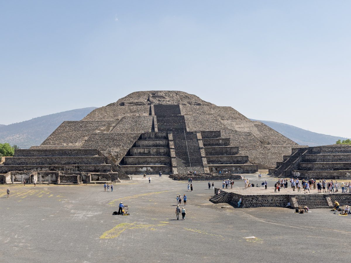 Located about 40 km northeast of modern Mexico City, Teotihuacán was founded around 100 BCE and reached its height between 200–600. At its peak, it had 125,000–200,000 inhabitants, making it one of the largest cities in the world at the time. The city’s layout is carefully planned along the Avenue of the Dead, featuring the Pyramid of the Sun, Pyramid of the Moon, and the Temple of the Feathered Serpent. It predates the Aztecs by centuries; when the Aztecs arrived (14th century), the city was already long abandoned. Around 550 CE, Teotihuacán fell. Possible causes: internal unrest (evidence of palaces being burned), drought, ecological collapse, attacks from rival groups.